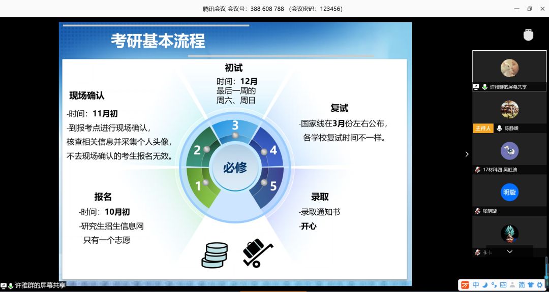 2020年3月14日,一场特别的“云端”考研经验分享会拉开了帷幕。为了帮助材料专业高年级的学生更有针对性地进行考研准备、复试,解决学生在考研方面的疑惑,同时引导低年级的学生更早地确定考研目标,在这个抗击疫情的特殊时期,beat365正版唯一官网发起,联合天津理工大学、天津科技大学beat365正版唯一官网,依托腾讯会议平台,通过线上交流的方式,开展了一场特别的考研经验分享会,共计164名同学参与了此次活动。