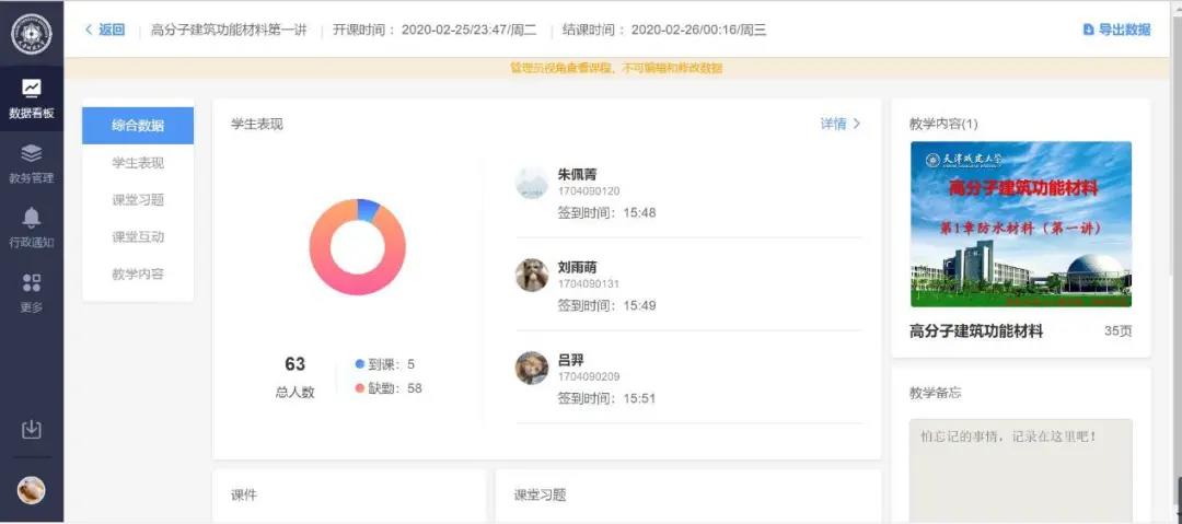 开课第一天,学院教师使用各类平台共完成本科生7门次课程的授课任务,参与学习的本科生394人次,学生出勤率100%。在进行网络授课时,任课教师加强与学生们的有效互动,效果较好。学院领导班子积极深入课堂进行督导,及时发现问题,保障教学秩序平稳运行。