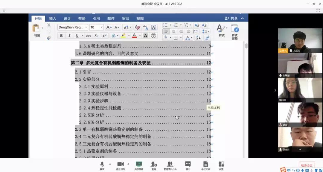 课题组严格落实教育部“教师不停教,学生不停学”的要求,按照学校疫情防控期间延期开学的相关部署,针对不同年级研究生的培养特点,远程指导学生完成学习和科研任务。课题组坚持每周利用网络会议系统,组织文献交流组会、论文撰写培训组会和实验结果讨论组会。广泛搜索在线学习资源,使用在线课堂教学与翻转课堂等方式,指导研一学生开展文献阅读与论文写作实践。采用一对一的定制化辅导模式,7*24小时在线与学生沟通交流,与研二学生讨论文献调研结果和实验进展,优化实验方案;指导研三学生学位论文撰写工作,提升论文质量。