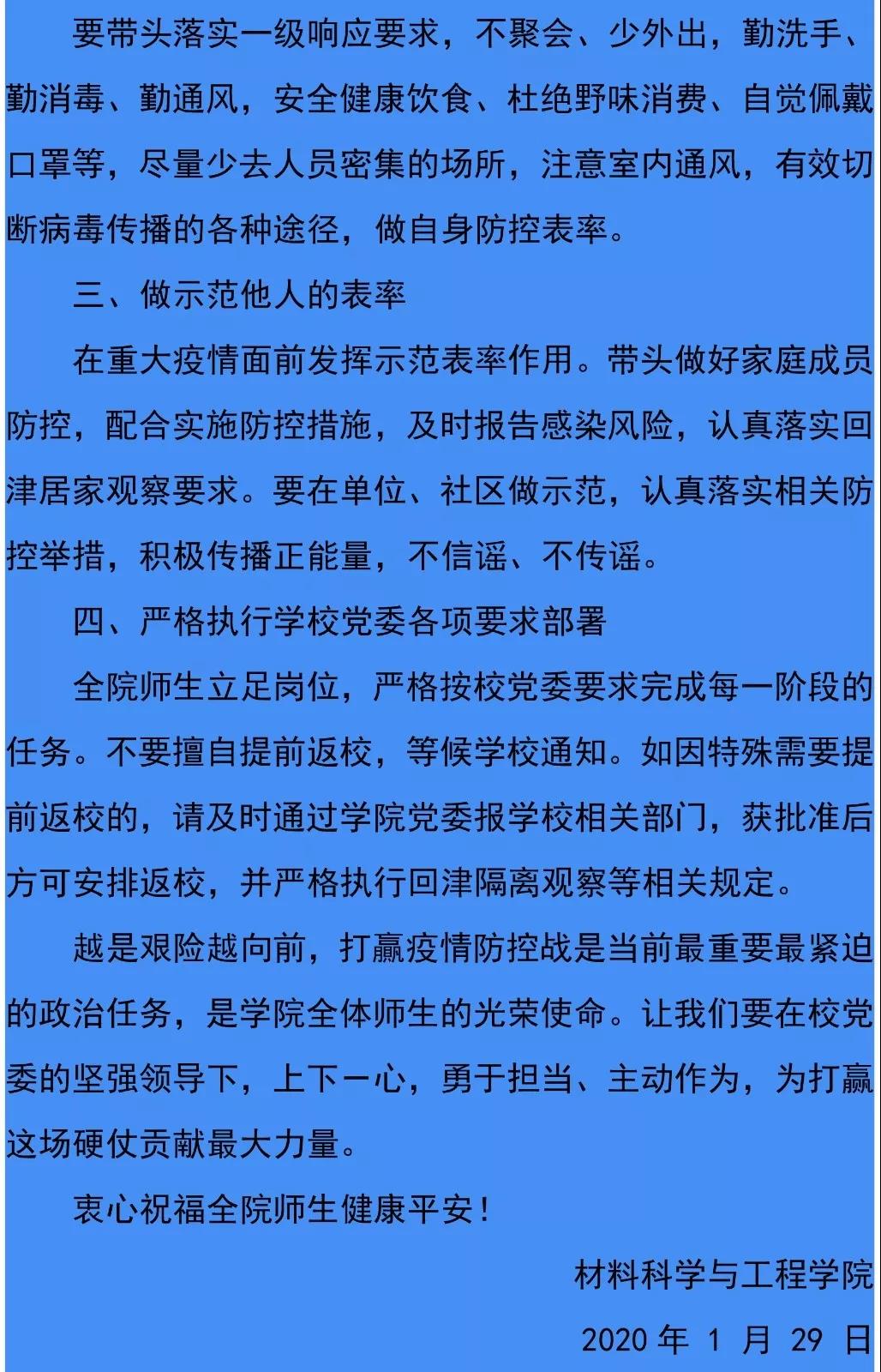 疫情就是命令,防控就是责任。为有效防控疫情蔓延,保障学院师生身体健康和生命安全,材料学院及时动员部署疫情防控工作,多措并举,筑牢防控工作安全网,全力以赴抗击疫情。