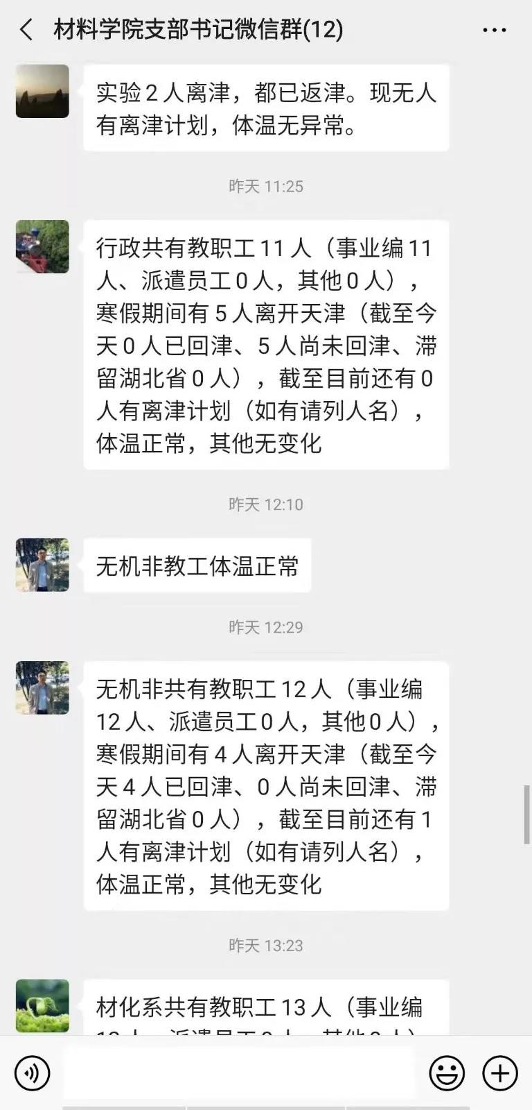 二是落实日报制度,进行严密管控。学院各教工支部及辅导员在防控工作领导小组领导下,采取电话、短信、微信、qq等渠道每日统计报告师生身体状况,严格落实每日零报告制度。同时针对湖北籍人员及疫情高发地区师生安排党委副书记持续追踪情况。